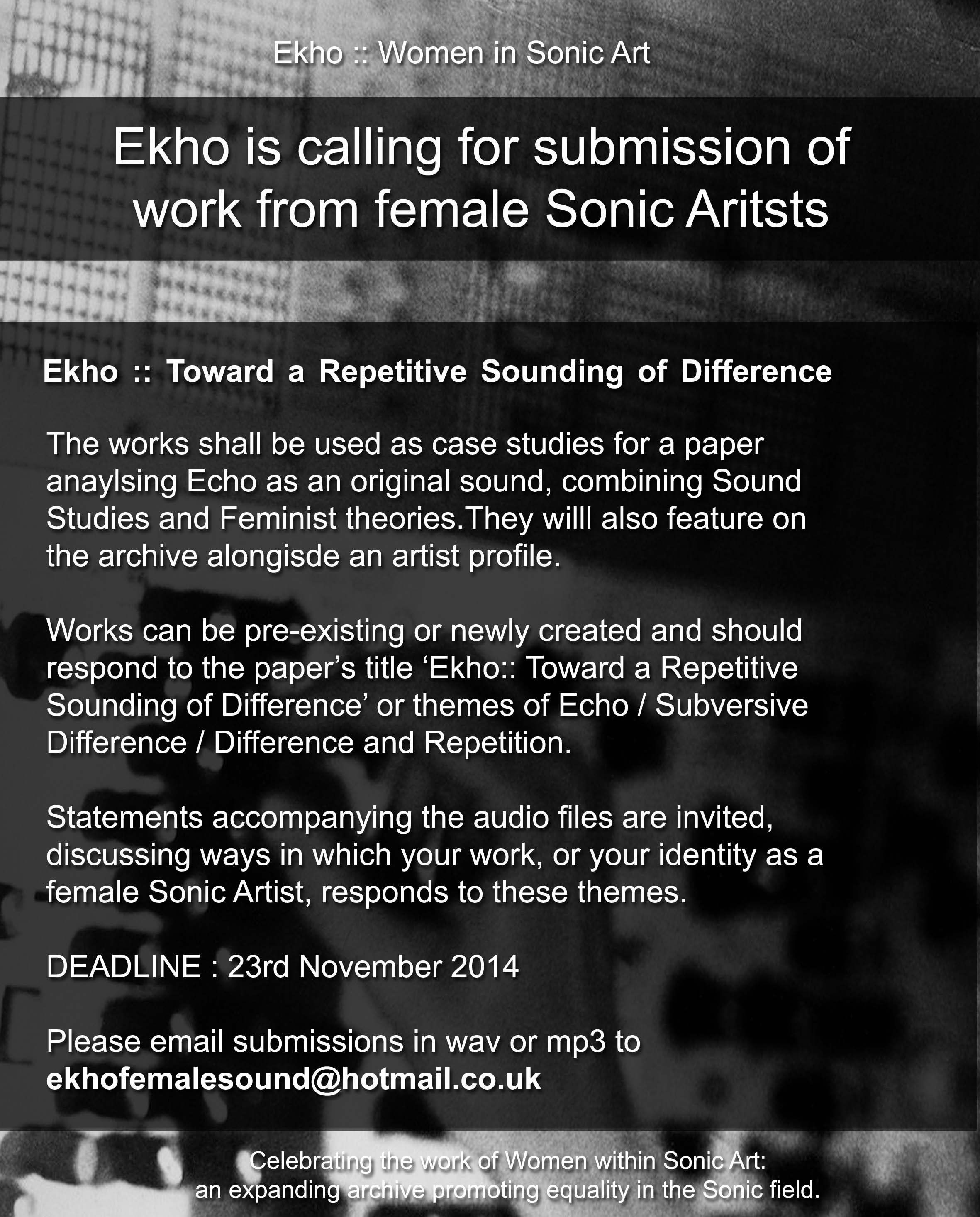 Calling for submission of work from female Sonic Artists for a paper entitled ‘Ekho :: Toward a Repetitive Sounding of Difference’. The paper will be analysing Echo as an original sound, combining Sound Studies and Feminist theories. All works will be included in the archive alongside an artist profile.